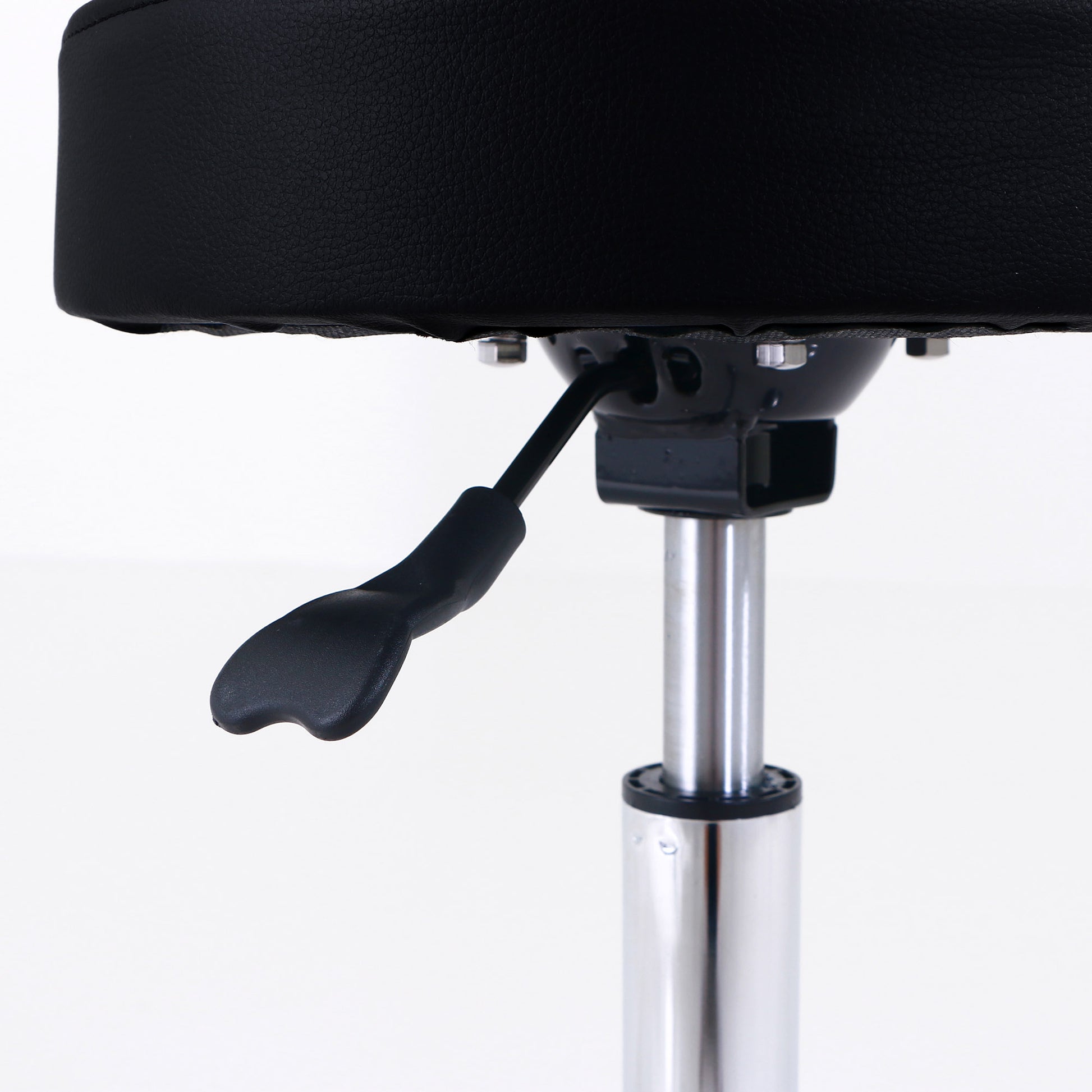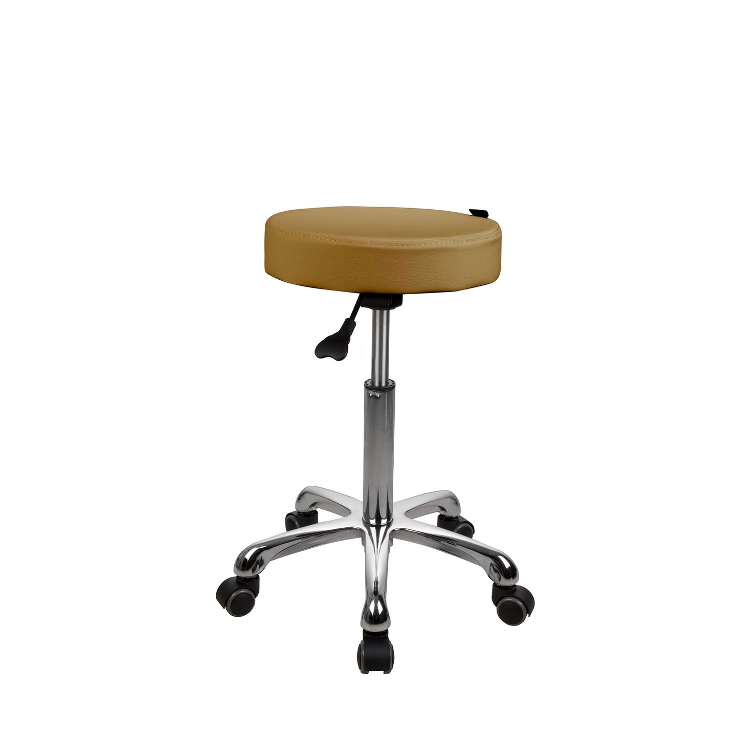 The stool is also available in black.Max Weight: 330Standard Control: ManualAssembly: RequiredUpholstery: PU LeatherBase: Chrome with 5 caster wheels